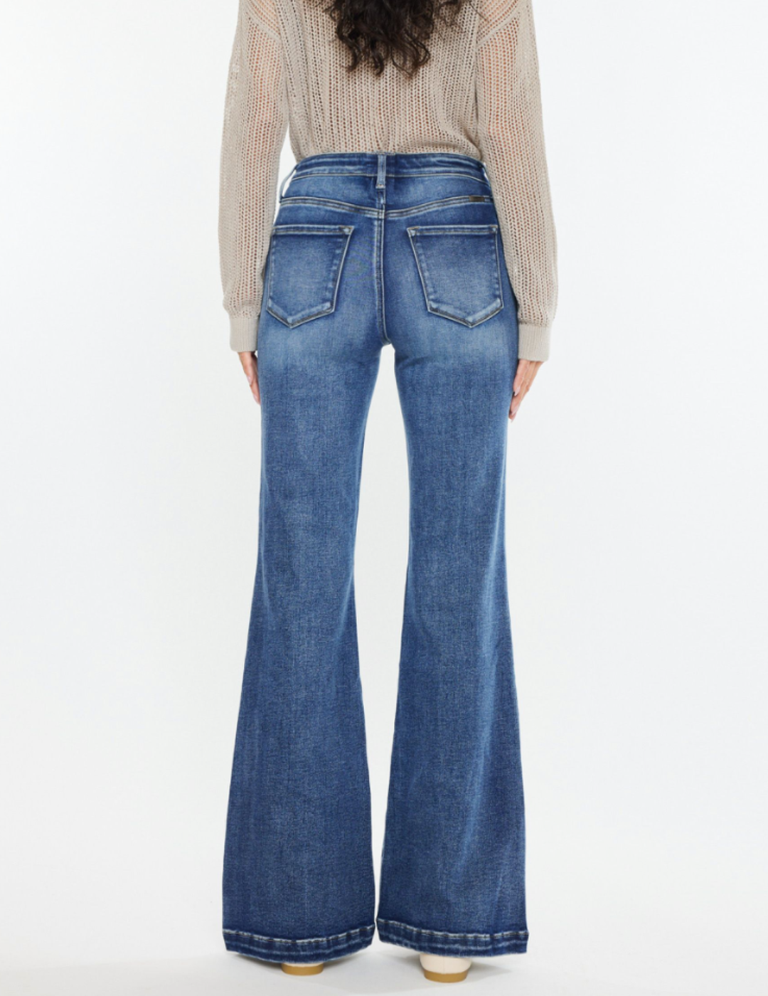 These Kancan Wide Leg Flare Jeans feature a medium wash and a high-rise fit. Crafted with stretch fabric, they offer flexibility and ease of movement. The regular hem and zipper fly ensure a classic finish, while the wide leg flare adds a touch of retro sophistication to your wardrobe. Perfect for creating a polished, yet relaxed look.