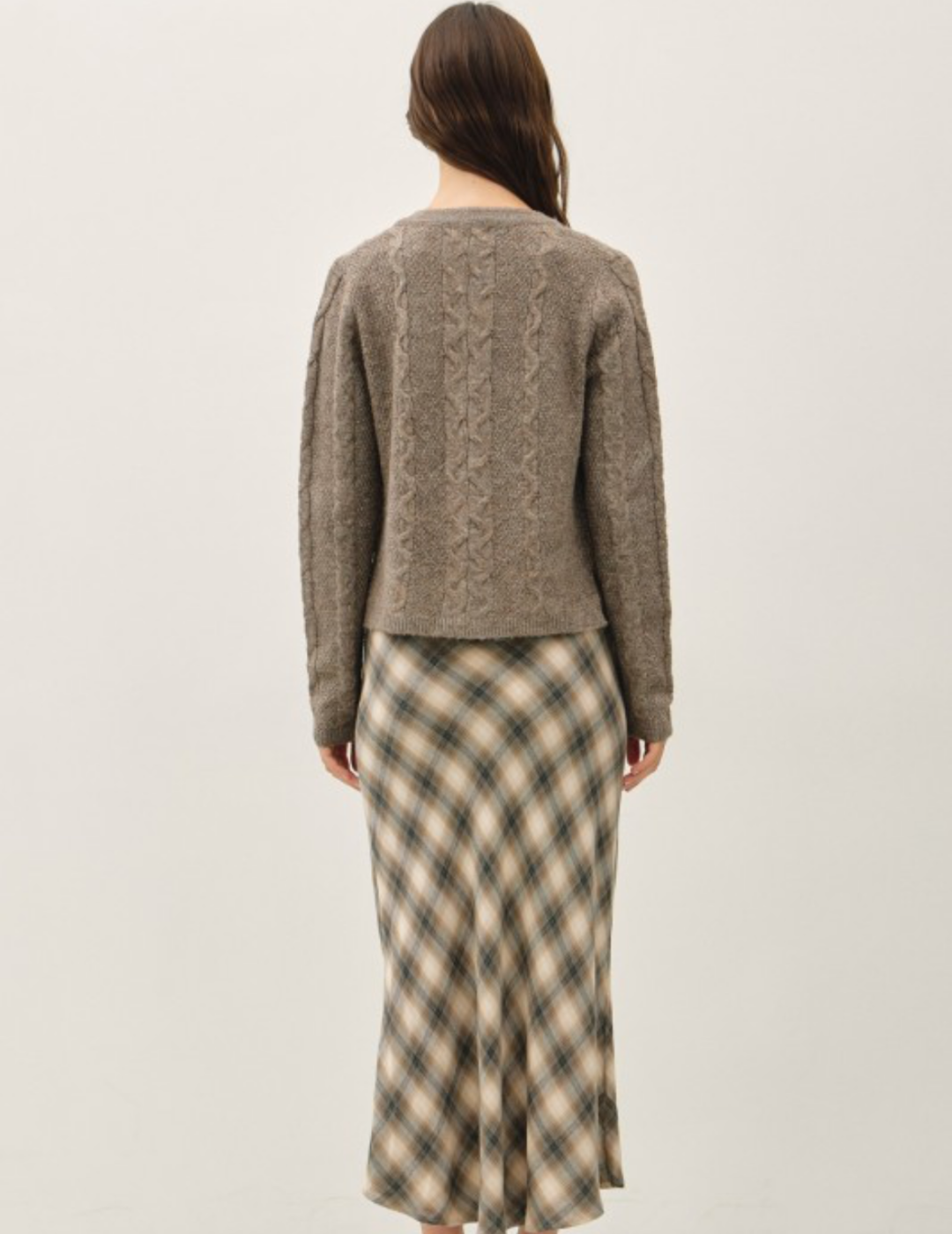 This oatmeal-colored open cardigan features a cozy cable knit design crafted from a soft wool blend, offering warmth and comfort. Its relaxed fit is enhanced by practical front patch pockets, making it an ideal layering piece for cooler days with both style and function.