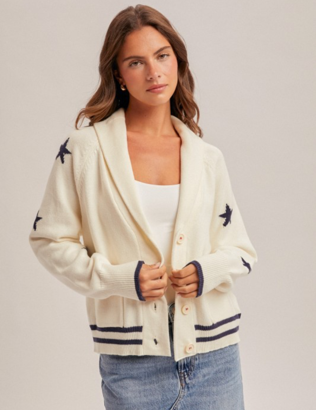 Wrap yourself in patriotic charm with this ivory cardigan sweater. Featuring a cozy shawl collar and blue striped detailing along the sleeves and hem, it's accented with delicate blue stars for extra flair. An adorable puppy wrapped in an American flag adorns the back, making this piece perfect for showing your love of country and cute companions. Ideal for layering on cooler days with timeless style.