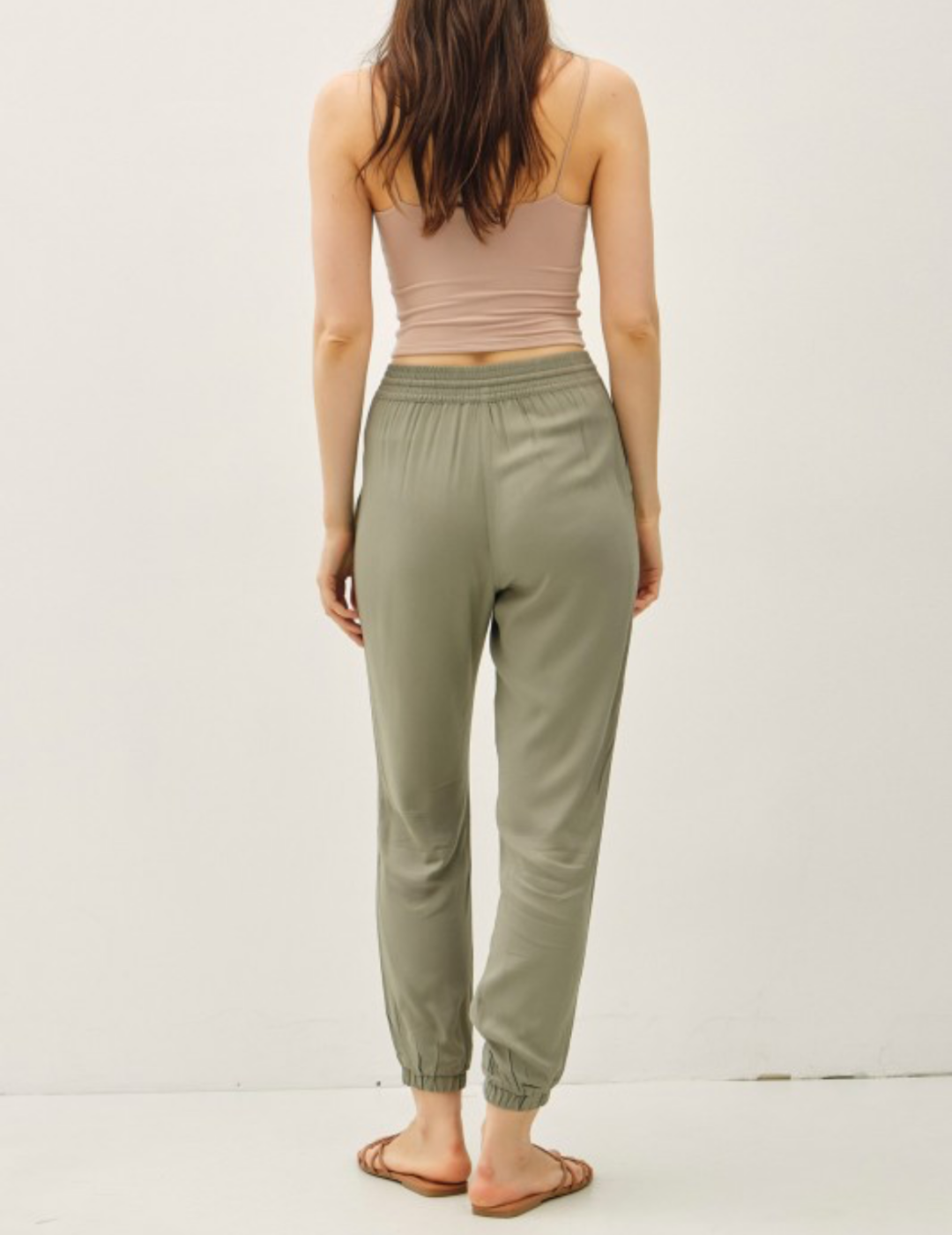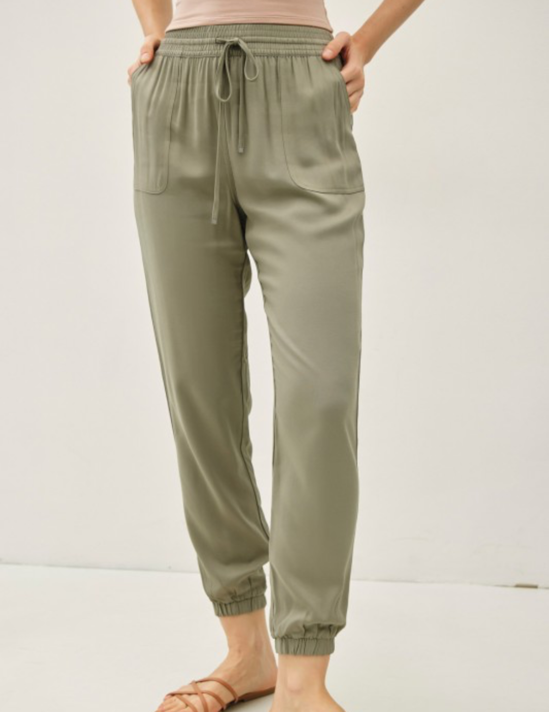 Elevate your casual wardrobe with these Sage Jogger Pants, designed for comfort and style. Featuring a high-rise fit and a pull-on silhouette, they offer an effortlessly chic look. The elastic waistband and leg openings ensure a secure yet flexible fit, complemented by a functional drawstring and convenient side pockets. Crafted from lightweight, breathable fabric, these joggers keep you cool while exuding understated sophistication. Perfect for relaxed days or polished casual outings.