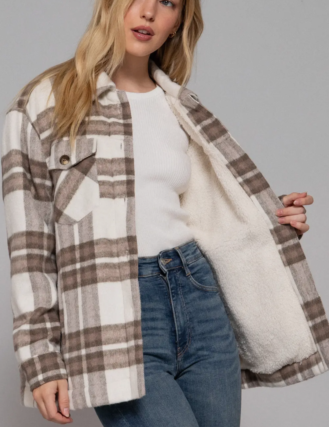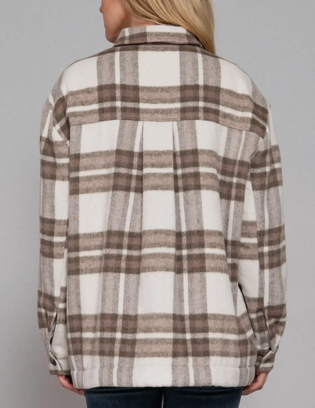 Layer up in style with this cozy taupe plaid shacket that's equal parts shirt and jacket. Featuring a classic button-down front, soft fleece lining for warmth, and practical pockets to stash your essentials, it's the perfect piece for transitional weather. The timeless plaid pattern pairs effortlessly with everything in your closet, making it a versatile go-to for casual days and weekend adventures.